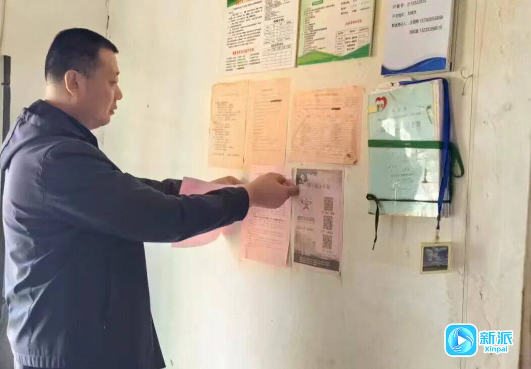帮扶责任人张贴政策宣传页。