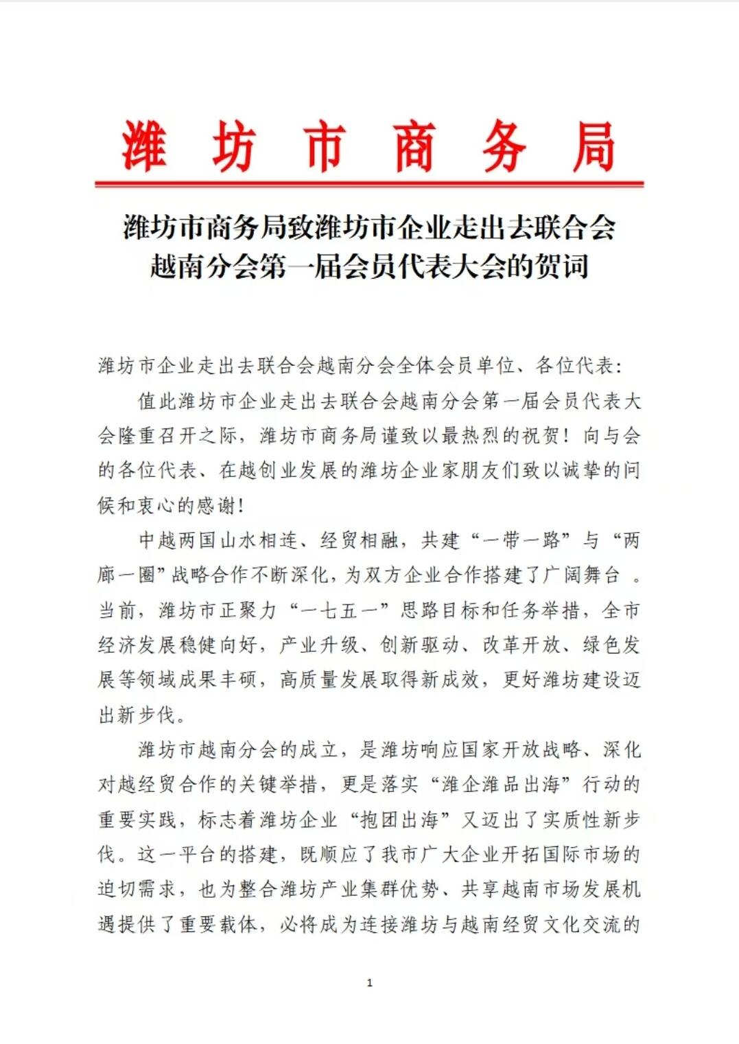 这是一场里程碑式的盛会,更是一次潍企扬帆远航的全新出发。今年9月,潍坊市商务局出访越南期间,为潍坊市企业走出去联合会越南分会揭牌,并从政策解读、资源对接、风险防范等维度,为分会建设提供全方位支持,全力护航潍坊企业“走出去”行稳致远。越南分会的成立,填补了潍坊企业在越南市场组织化服务的空白,将散落的“满天星”汇聚成发展的“一团火”,有效提升潍坊企业在越南市场的整体竞争力。