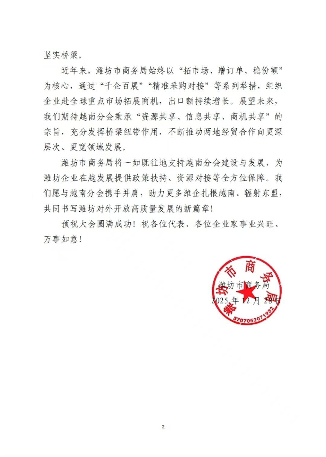 新派讯 岁序常易,新章又启。踏着“一带一路”合作深化的时代节拍,为凝聚潍坊企业出海合力、架起潍坊与越南经贸互通的坚实桥梁,12月28日,潍坊市企业走出去联合会越南分会第一届会员代表大会在越南河内召开。这不仅是潍坊市响应国家对外开放战略、深化对越经贸合作的关键落子,更是潍坊企业告别“单打独斗”、迈向“抱团出海”组织化、规范化发展的重要里程碑。