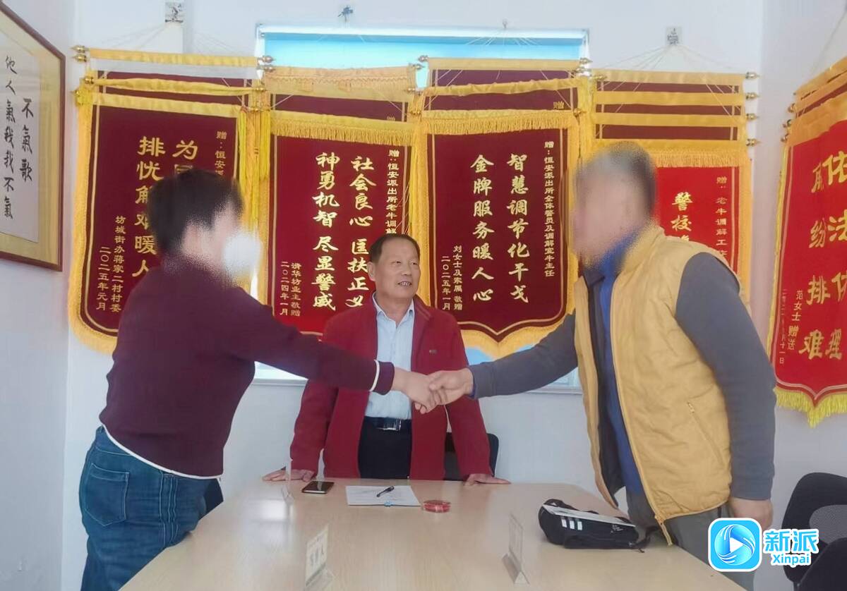 在恒安派出所老牛调解室,当事人在调解员牛洪起的调解下握手言和