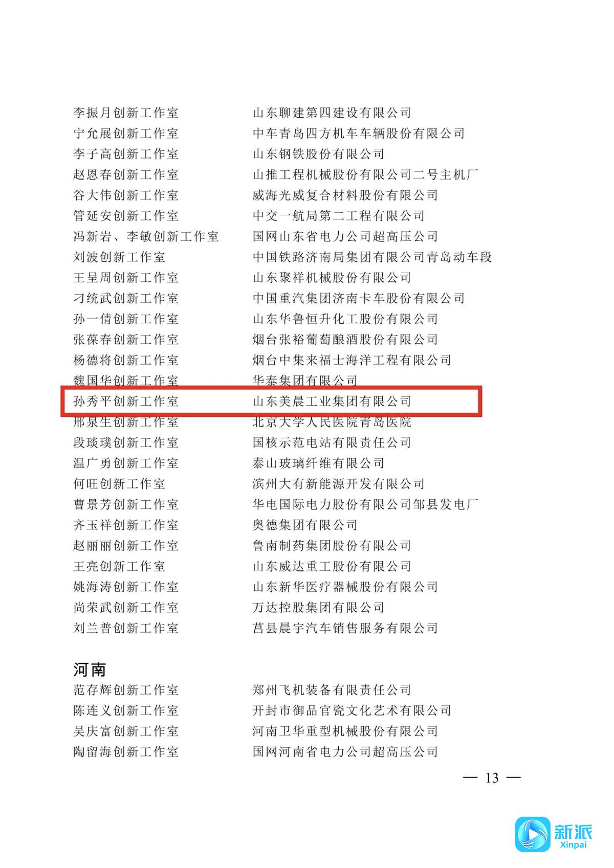 新派讯 近日,中华全国总工会办公厅公布2025年全国总工会支持建设全国劳模工匠创新工作室名单,山东美晨工业集团孙秀平创新工作室成功入选。