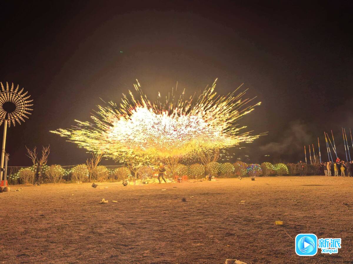 当天晚上8时,振奋人心的舞狮舞龙表演刚刚结束,广场上的打铁花表演便骤然开场。赤红的铁水被艺人奋力撒向夜空,万千金红火星瞬间炸开,如同漫天流星坠落,又似金菊盛开,游客们将广场围得里三层外三层,纷纷举起手机记录这一美好景观,一阵阵此起彼伏的惊呼与掌声,映照着一张张兴奋的脸庞,很多游客直呼“年味足,真过瘾”。