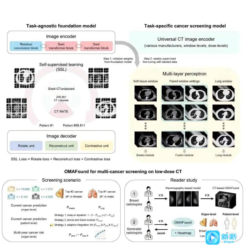 新派讯 近日,潍坊市第二人民医院(潍坊市呼吸病医院)牛庆亮教授作为共同第一作者,与上海科技大学生物医学工程学院钱学骏教授、安徽医科大学第一附属医院裴静教授等团队合作,在国际顶级学术期刊Nature(《自然》)全新子刊Nature Health(《自然-健康》)在线发表重要研究成果,题为“A foundation model for breast and lung cancer screening using non-contrast computed tomography(一种利用非对比性计算机断层成像技术进行乳腺癌和肺癌筛查的基础模型)”。