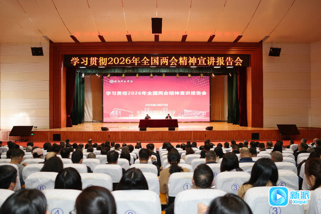 新派讯 3月25日,潍坊科技学院召开学习贯彻2026年全国两会精神宣讲报告会。邀请第十四届全国人大代表、三级教授、学校设施蔬菜新质生产力研究院院长邹宁作宣讲报告。校领导付乐启主持会议并作总结讲话。校级领导班子成员,科长及以上干部,科研人员,全体辅导员、导师、班主任,组织员、学生党支部书记等共计1200余人参加。