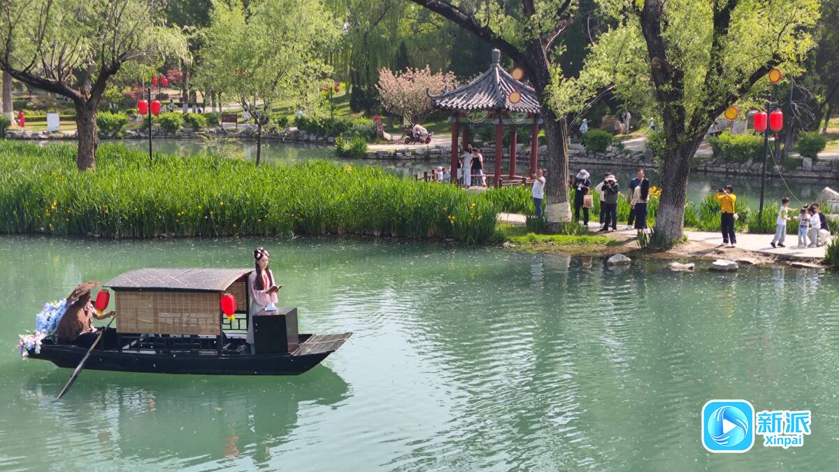 第二届李清照诗词文化周活动现场,以古代人读书场景装饰的游船吸引游客关注。