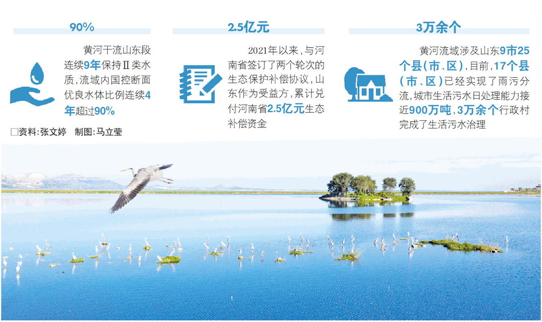 落实好黄河流域生态保护和高质量发展战略部署,要坚定不移走生态优先、绿色发展的现代化道路。近年来,山东扎实推动黄河流域生态保护和高质量发展,以改革之进促水质之变。山东率先在全国实现县际流域横向生态补偿全覆盖,全省拥有跨界河流的133个县(市、区)全部签订协议,共涉及断面301个。2024年,全省153个地表水国控断面优良水体比例达79.1%,V类及以下水体动态清零。黄河干流山东段全线稳定保持Ⅱ类水质,流域内国控断面优良水体比例连续4年超过90%。