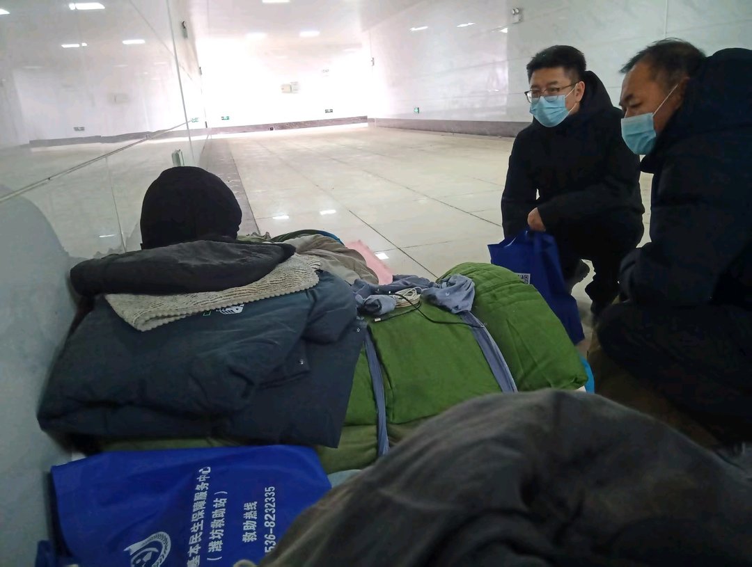 晚上天更冷了,巡查也没停下来。这次,潍坊市基本民生保障服务中心还联合了社工、志愿者等社会力量,把中心城区划成5个重点区域,展开“拉网式”排查。主要街道、自动取款间、地下通道、桥梁涵洞、在建工地、废弃房屋…… 只要是可能有人露宿的地方,大家都仔细搜了个遍。碰到疑似临时遇困的人,工作人员就耐心询问情况,并劝其到救助中心去;对明确表示不想接受救助的,发放救助联系卡,告知求助渠道,并将棉衣、棉鞋、棉被、保温壶等御寒物资送到他们手中,确保每个人都能平稳过冬、温暖过节。