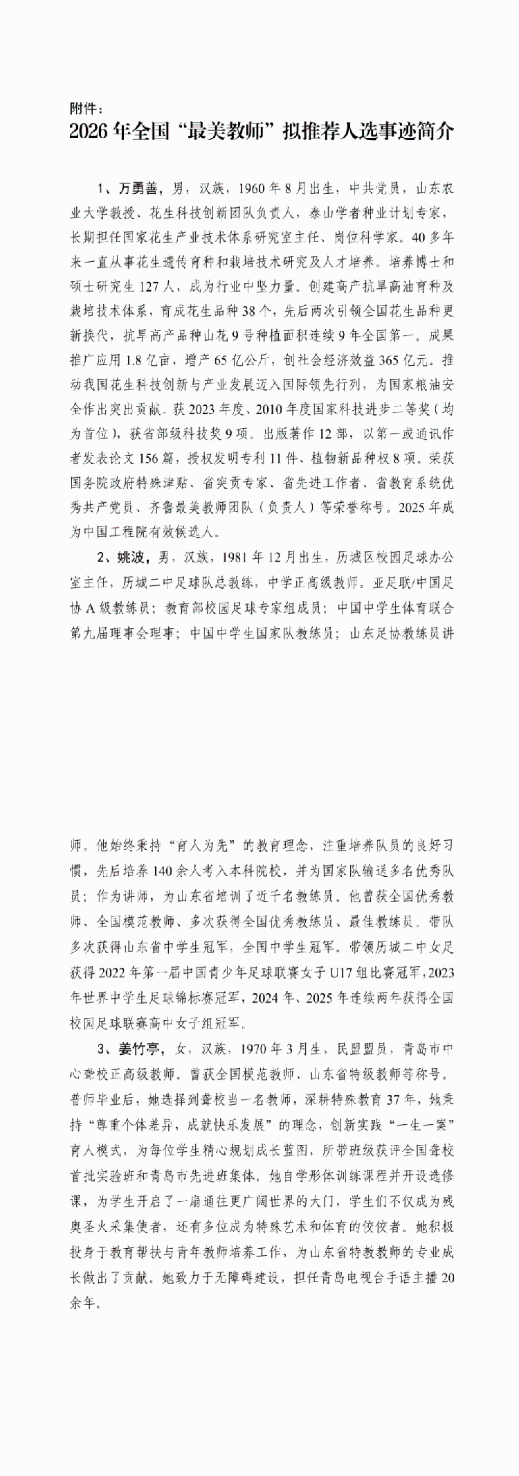 根据教育部教师工作司《关于开展2026年全国最美教师选树宣传活动的通知》要求,经专家遴选,现将2026年全国“最美教师”拟推荐人选予以公示。公示期为2026年4月9日至4月16日。