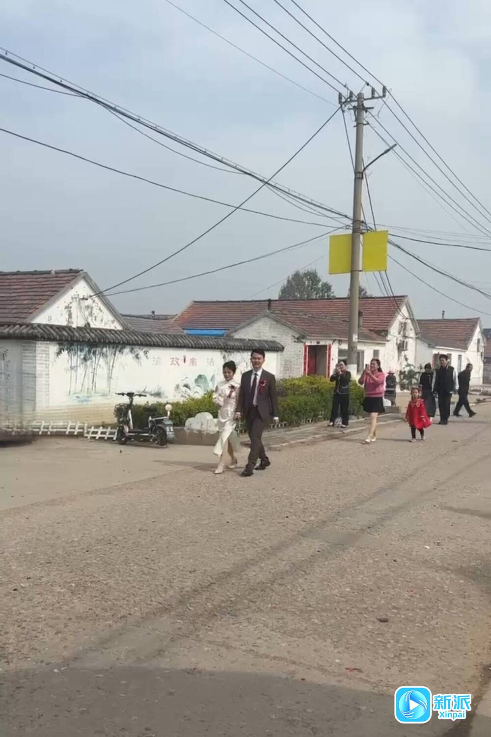当日,涌泉村大街上满是欢声笑语。王俊峰、何井兰牵着手徒步前行,脸上洋溢着幸福的微笑。村民们站在道路两旁,为新人送上祝福,用手机记录下他们的幸福时刻。