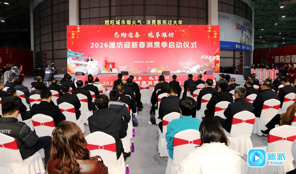新派讯 2月5日上午,“惠购迎春·悦享潍坊”2026潍坊迎新春消费季启动仪式在富华国际展览中心举行。市委书记刘运,省商务厅党组成员、副厅长蔡培安致辞;市政协主席李爱杰、市人大常委会主任高峰出席;市委常委、副市长狄波,有关金融机构、省级商协会、电商平台负责人等参加。