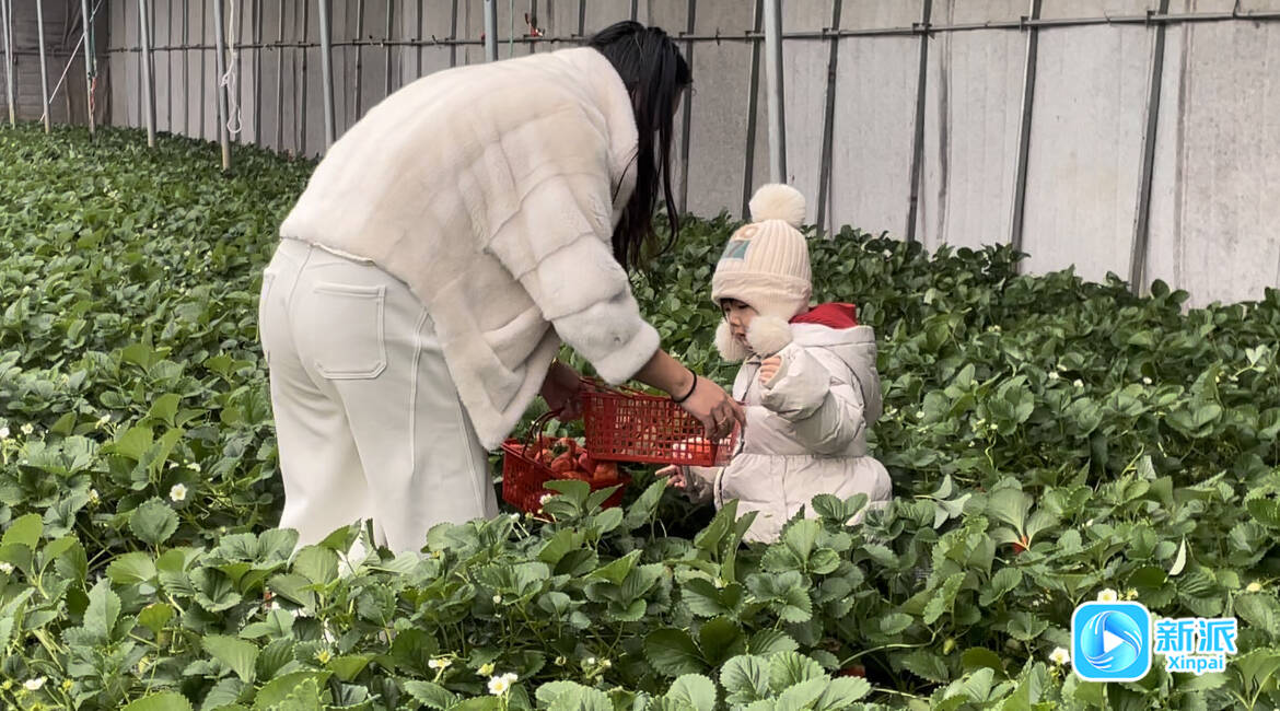 市民在圣林种植家庭农场草莓种植棚内采摘草莓。