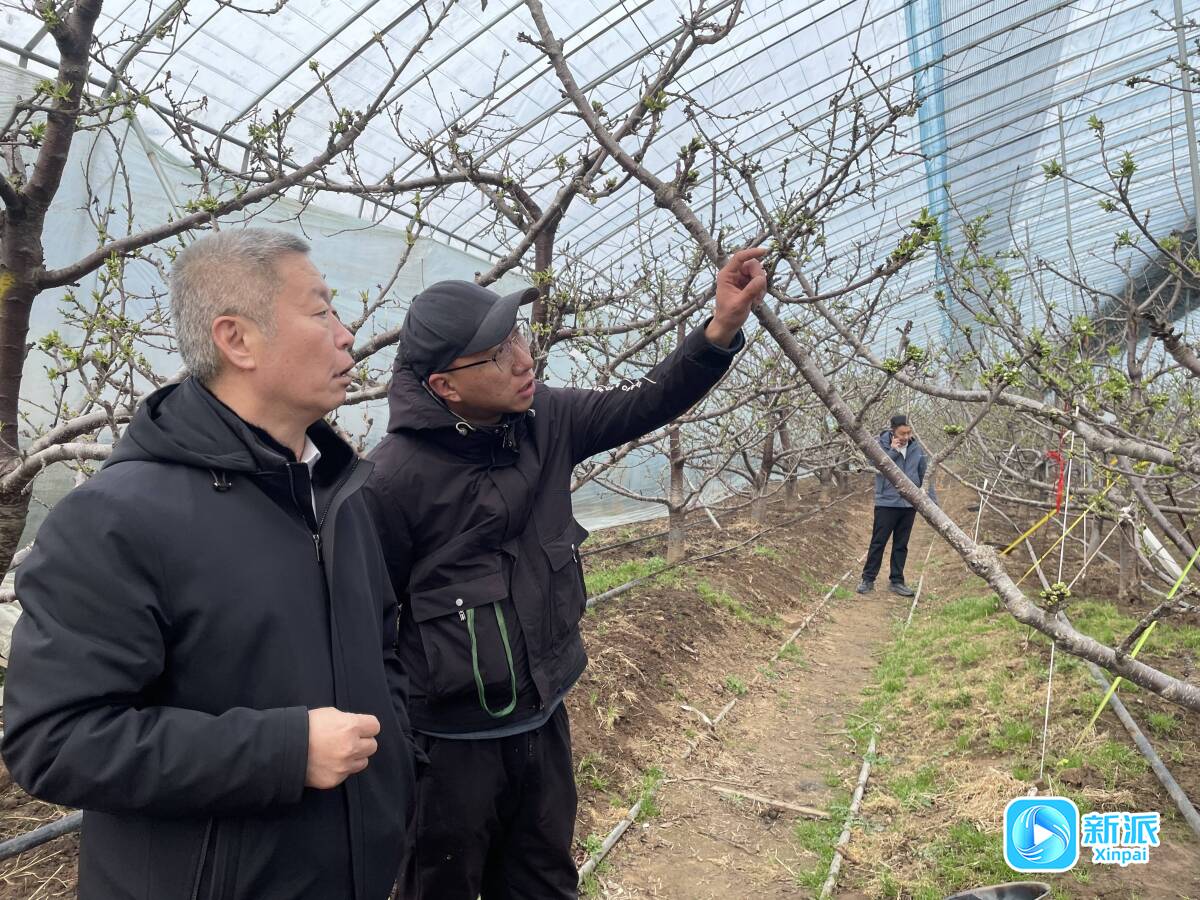 在马司土地专业合作社樱桃种植大棚内,工作人员查看作物长势情况。
