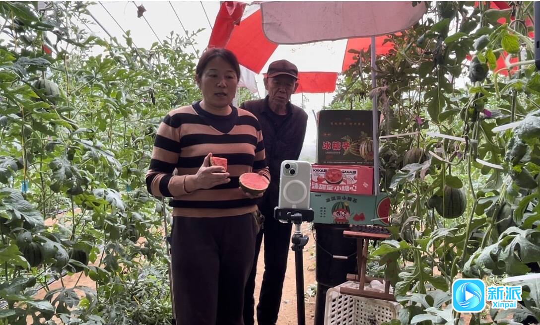 伟轩种植专业合作社负责人刘桂荣在西瓜大棚直播。
