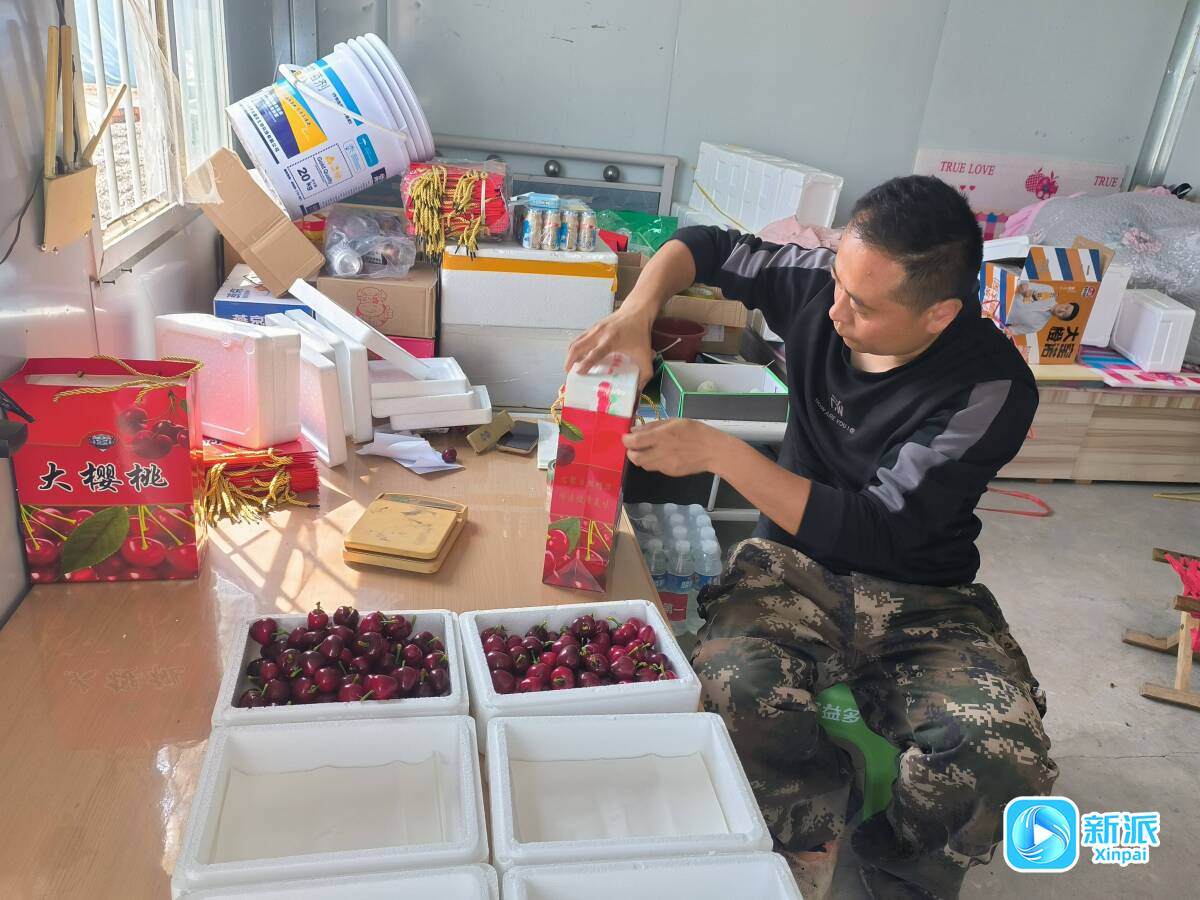 “90后”农场主张可凯正在将分拣好的樱桃打包装箱。