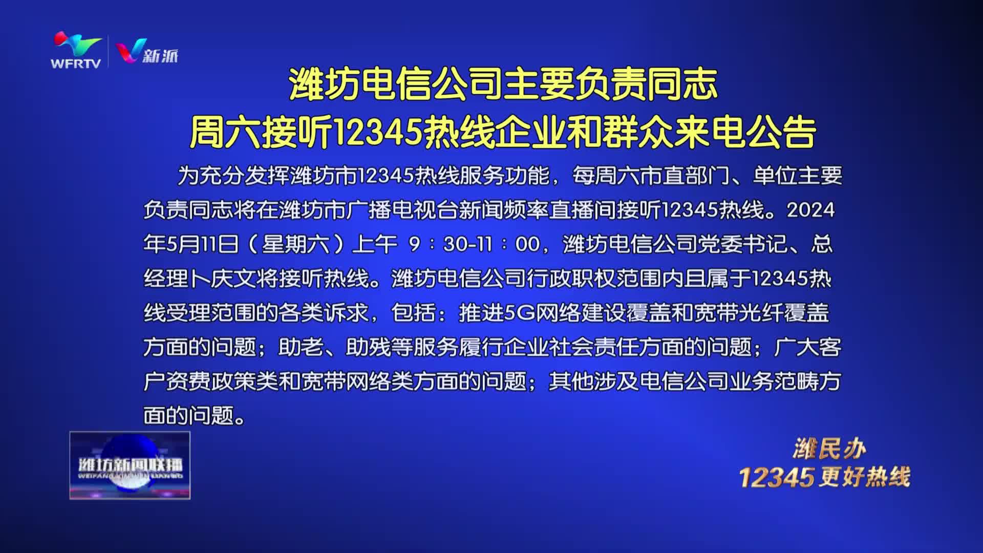 【潍坊新闻联播】潍坊电信公司主要负责同志周六接听12345热线企业和群众来电公告