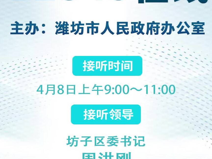 4月8日上午9:00~11:00,坊子区委书记周洪刚将走进市融媒体中心新闻频率《12345在线》直播间接听热线。节目通过新派客户端、潍坊新闻广播视频号、闪电新闻客户端、天下潍观视频号同步直播。