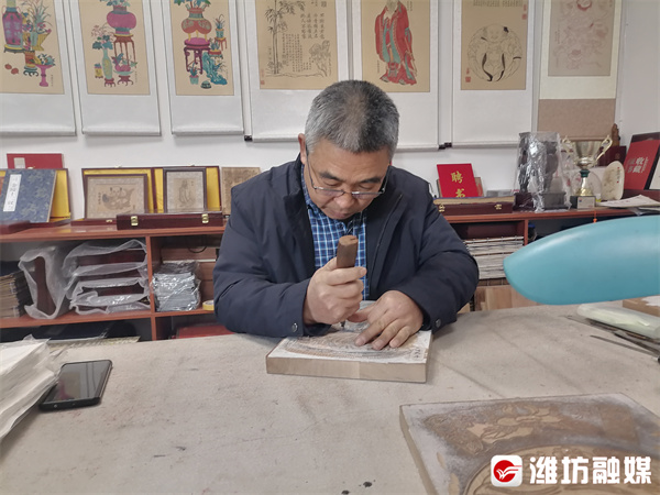 潍坊日报社潍坊融媒讯 12月30日,在寒亭区杨家埠旅游开发区和兴永画店内,杨家埠木版年画省级非物质文化遗产传承人杨乃东正在雕刻一块线板。“薄薄的一张年画从选材到印刷出来需要四五十道工序,每道工序都考验人的手艺。”杨乃东说。