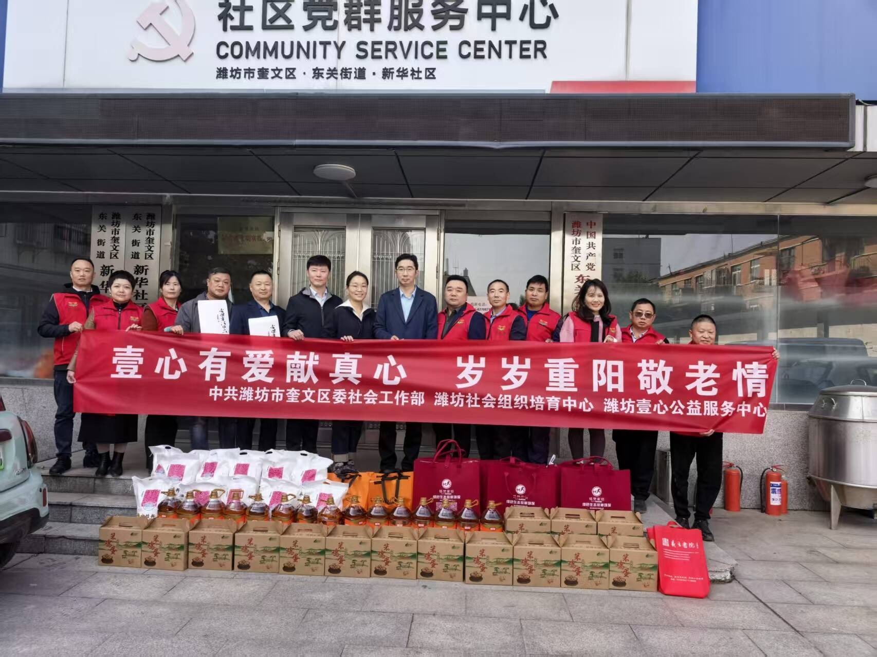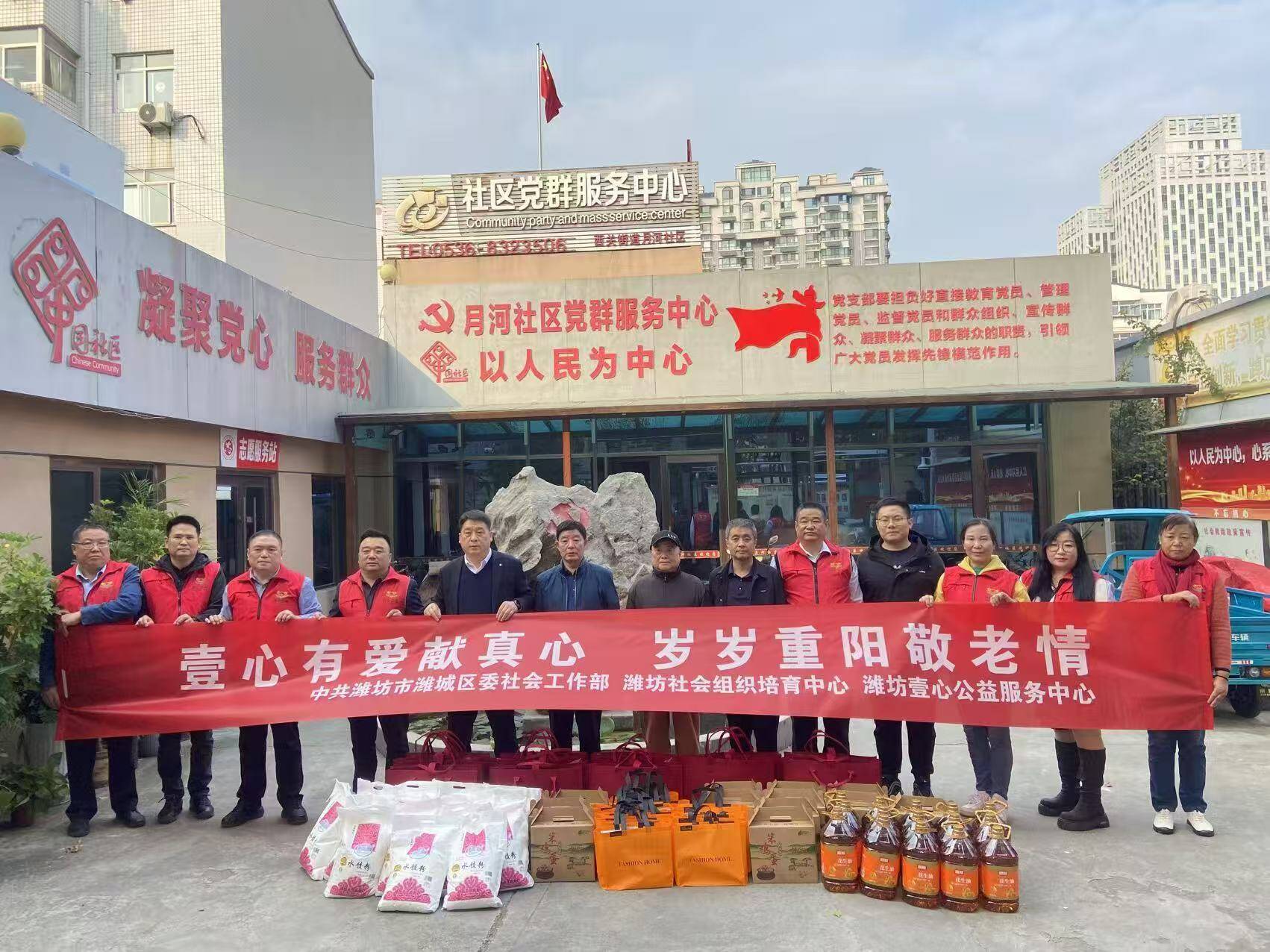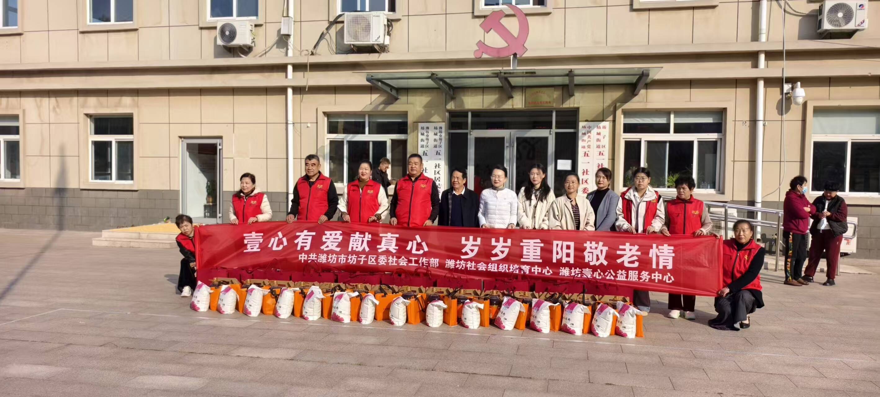 今年重阳节潍坊壹心公益服务中心的活动主题是“壹心有爱献真心 岁岁重阳敬老情”组织购买了毛绒毯、床单、花生油、饺子粉和鸡蛋共计四十五份,在中共潍坊市潍城区委社会工作部、中共潍坊市奎文区委社会工作部、中共潍坊市坊子区委社会工作部和潍坊社会组织培育中心的统筹安排下,来到潍城月河社区、奎文新华社区和坊子坊城街道办事处各看望十五户老年家庭,送去礼品的同时,向他们表达政府和公益组织关心和关爱老人之情。