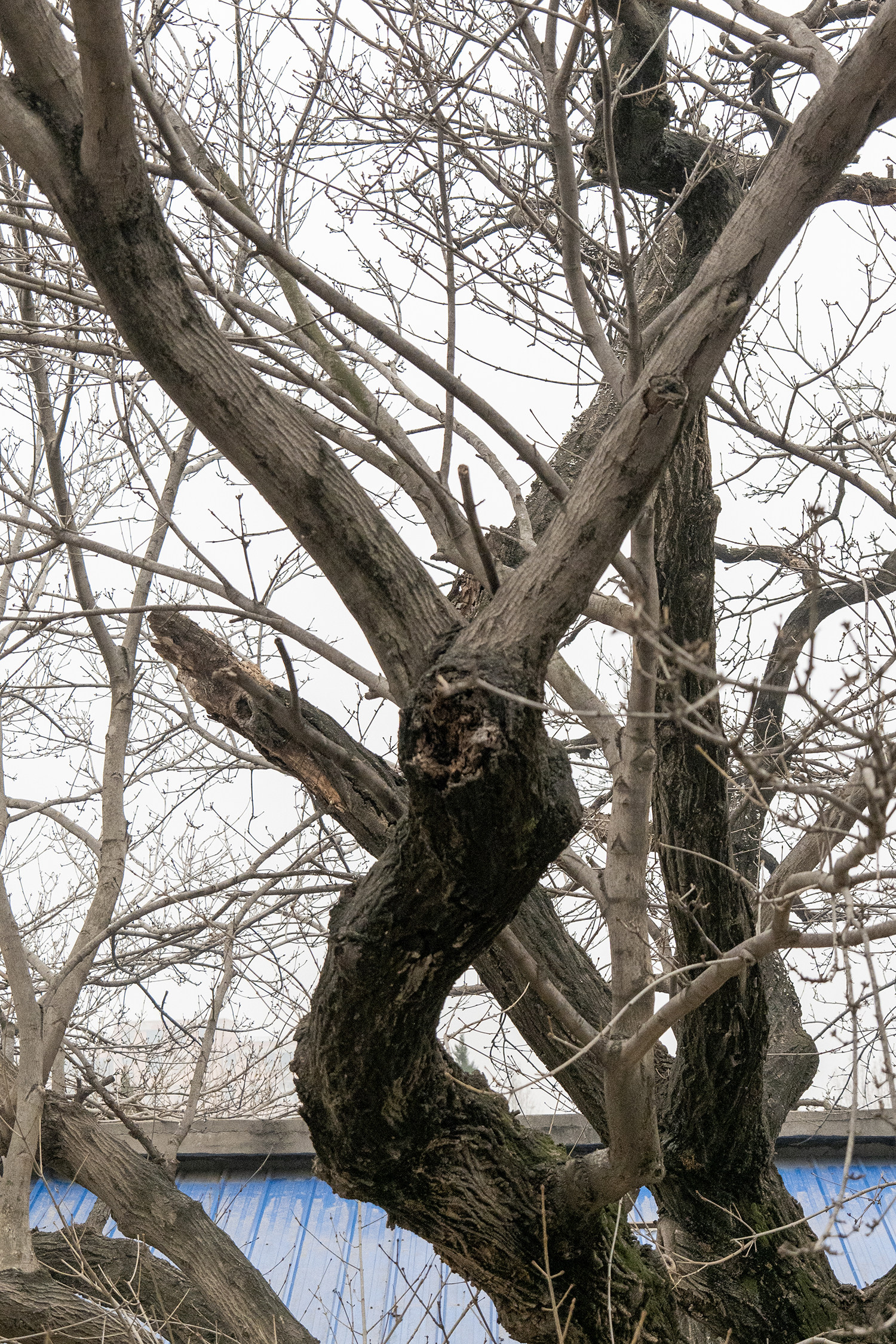 粗壮的树干是它最引人注目的地方,大大小小的树瘤从底部一直向上延伸,就像饱经风霜的老人手背凸起的青筋,分叉的树枝像五个手指一样指向天空;树皮早已褪去了初生时的光滑,变得粗糙而厚实,深深浅浅的裂纹纵横交错,是岁月用风雨打磨出的独特纹路。