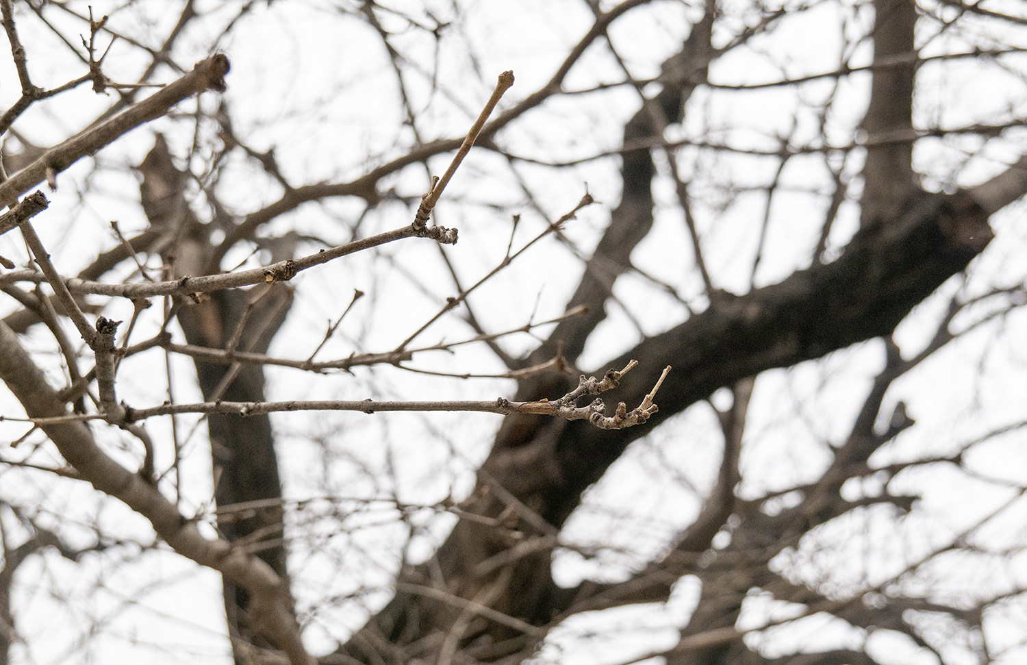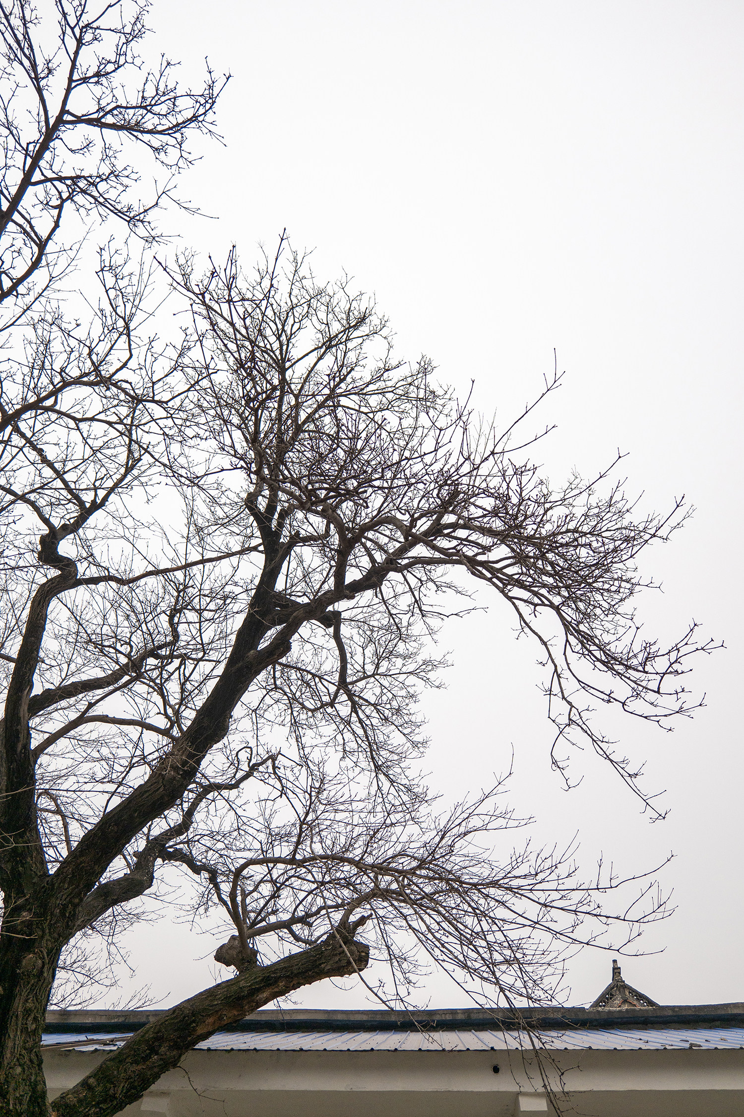 冬天的古树,褪去了满身的树叶,却又在不经意间透出一种沉静的生命力量。那是在黑褐色的老枝上又分出的一簇簇白色的枝丫,它们向四面八方延展,为这古老的生命继续书写坚韧与生机。