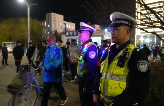 当寒夜漫过街巷,高中学生晚自习放学时段,交管部门民警辅警早已守在校门口,他们在车流中疏导交通,提醒司机“减速让行”。看到学生独自骑车,便上前叮嘱“注意安全”,用警灯为孩子们照亮归途。