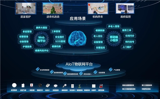 中移物联自研的AIoT智能物联网管理平台,是方案的核心中枢,为康养设备企业提供一站式蜂窝接入与管理服务。平台兼容性极强,可无缝适配智能手表、呼叫网关、AI跌倒监测仪、辅助骨骼机器人等多款设备,能显著降低企业研发与部署成本。更为核心的是,平台全面融合健康感知技术与DeepSeek大模型,打造“能力评估-照护建议-风险预警-健康管理”的全流程AI服务体系,凭借“主动预警、实时分析、可视化监管、数据运营、应急闭环”五大能力,构建“终端感知-云端分析-生态联动”三维架构,适配居家看护、机构养老、适老化改造、政府监管等多元场景,全面助推银发健康服务数字化升级。
