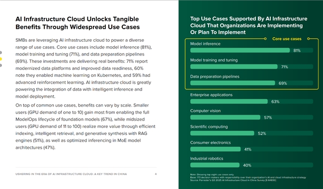作为面向计算密集型任务的AI原生平台,AI基础设施云(智算云)正深度融入企业运营全链条,并创造切实效益:71%的企业数据平台实现了现代化升级,数据准备能力显著提升;60%的企业成功在Kubernetes上部署机器学习,提升模型部署效率; 59%的企业应用更先进的强化学习技术,加速模型迭代优化。目前,AI基础设施云(智算云)正有力推动数据与智能推理、模型部署的深度集成,在计算机视觉(57%)、科学计算(52%)、工业机器人(40%)等关键行业场景构建起“数据-模型-应用”闭环。