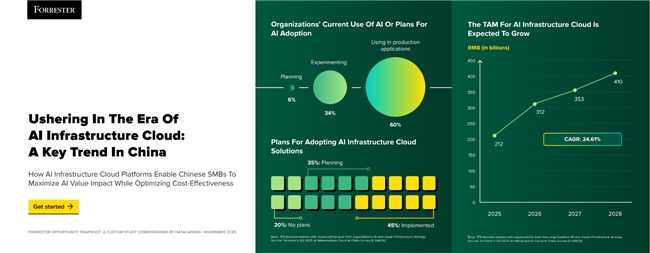 国际权威研究咨询机构Forrester最新调研数据显示,94%的中国企业已启动AI部署或在生产环境中密集应用AI技术。其中,45%的企业通过AI基础设施云承载AI工作负载,另有35%计划在未来12个月内完成部署。这一数据清晰印证,AI基础设施云已成为中国产业智能化转型的核心支撑载体。在“AI+”政策赋能与企业加速将AI转化为“超级生产力”的双重驱动下,中国AI基础设施云正迈入“普惠化”发展新阶段。