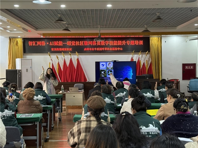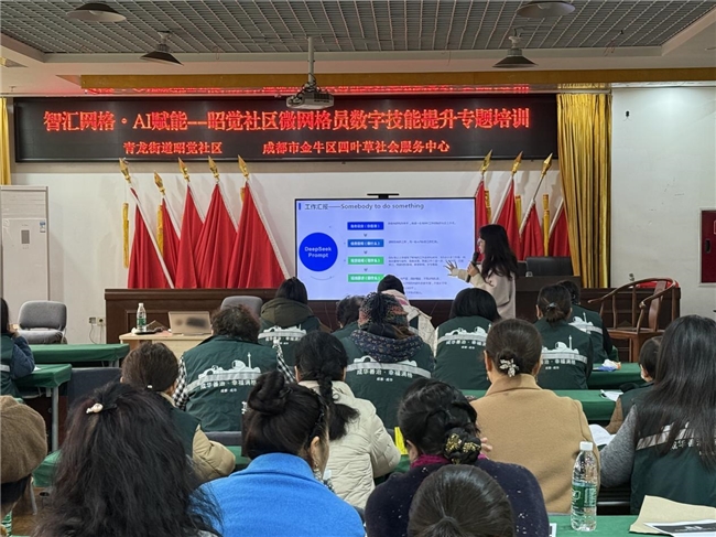 为主动适应数字化时代发展趋势,全面提升社区微网格员的综合能力与工作效率,2025年12月2日,四川省成都市成华区青龙街道昭觉社区联合金牛区四叶草社会服务中心,在社区5楼会议室成功举办了“智汇网格·AI赋能”微网格员数字技能提升专题培训会,为50名辖区微网格员带来了一场内容丰富、实用性强的“数字盛宴”。