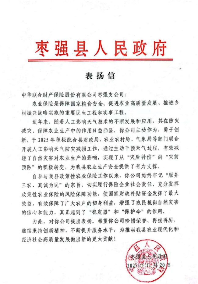 近日,中华财险枣强支公司因在农业风险减量服务中的创新实践,获得枣强县人民政府通报表扬。这标志着“保险+气象”服务新模式在基层落地见效,为农业防灾减灾工作提供了可复制的实践范例。