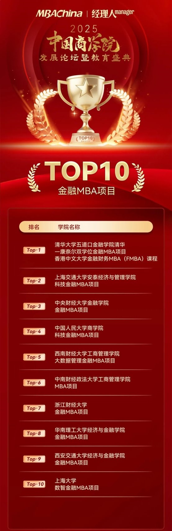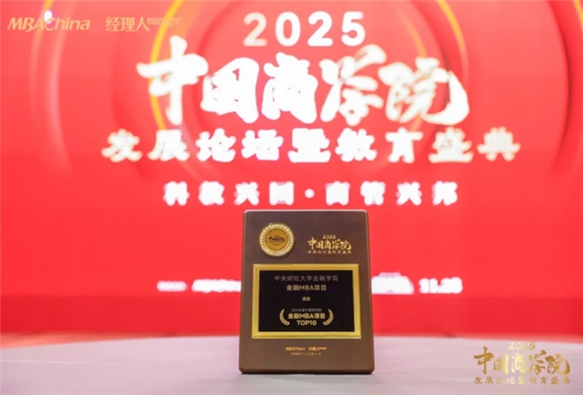 盛典现场重磅发布了 “2025年度中国商学院金融MBA项目TOP10”排行榜。在众多参评项目中,中央财经大学金融学院金融MBA项目凭借雄厚的学术实力、领先的培养体系与卓越的行业认可度荣获2025年度中国商学院金融MBA项目TOP10第三名,充分彰显了中财金融教育的硬实力与品牌影响力。