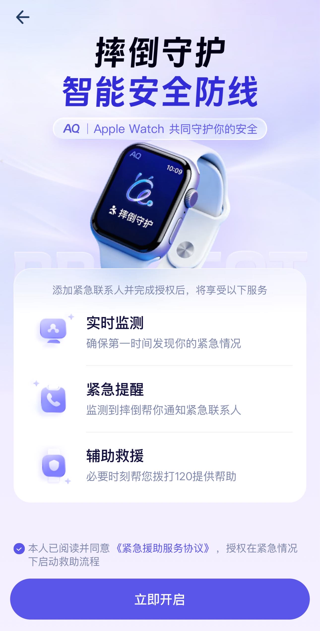 继与 Apple Health 打通运动健康等服务后,近日,蚂蚁集团旗下 AI 健康管家应用AQ再与 Apple Watch 实现深度软硬件协同,推出“摔倒守护” 服务,为用户提供紧急响应、在线急救指导、急救费补贴等防护保障。即日起,Apple Watch用户通过 AQ APP 进入“健康档案 - 紧急援助” 板块,完成 Apple Watch 设备授权即可开通该服务。