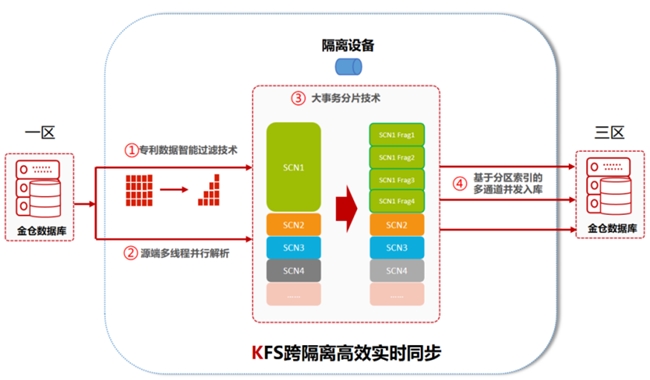 基于金仓异构数据同步软件KFS采集端多线程流水线作业、大事务分片、加载端多通道并发入库创新技术,支持故障自动恢复、断点续传,通过单向隔离设备,实现一区到三区的高效、可靠数据同步。
