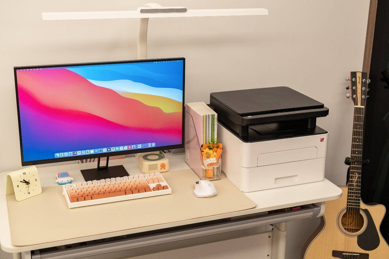外观方面,汉印TG1000MD采用了打印机中经典的黑白熊猫配色,在沉稳雅致的同时也不显呆板,而且跟我的桌面很搭。在我用过的打印机里面,汉印TG1000MD的尺寸控制得相当紧凑,相对更小巧,但如果想要把它摆在桌子上的话,最好还是选择1.4米以上长度的桌子。