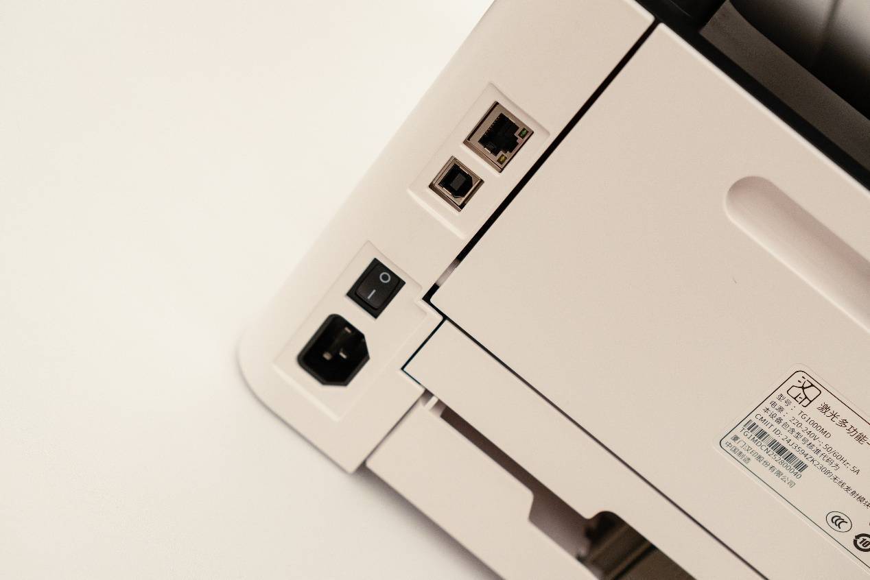 打印机开关和接口被设置在背面,除了电源接口外,还有一个RJ-45网线接口,以及一个用于连接电脑的USB Type-B接口(包装内附赠Type-B转Type-A数据线)。