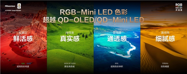 从影像的光学原理到“中国色”的文化表达,海信预研与技术管理中心总经理王烨东以科技解读,海信历经20余年持续研发,率先实现RGB-Mini LED电视的规模化落地,至少领先行业一年,让中国显示产业从国际标准跟随者一跃成为“中国方案”输出者。这背后,海信自研的信芯AI画质芯片H7和RGB-Mini LED三原色自发光芯片,攻克光色同控、发光效率等多项世界性难题,实现从“控光”到“光色同控”的跨越,支持行业量产最高的3×10240分区控制和行业最高108bits控色精度,实现光与色的同步精准掌控。基于此,海信RGB-Mini LED电视的色域覆盖面积高达100%BT.2020,比QD-Mini LED高19%,比QD-OLED高9%;其87%超高色彩体积领先QD-Mini LED 20%,领先QD-OLED 3%,色彩表现全面超越QD-OLED和QD-Mini LED。同时,海信RGB-Mini LED电视凭借三原色直驱显示架构,较QD-OLED节能40%以上,在高画质与低能耗之间实现完美平衡。