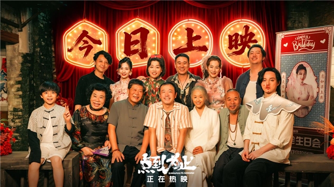 在今日发布的“热闹开演”正片片段中,从心镇全员上阵的“功夫盛典”展现在观众面前。尹正饰演的金毛一支穿云箭射向天空,灿烂烟花瞬间绽放,不但直接看呆片中的投资人,也将观众拉入影片浓浓的爆笑贺岁氛围。伴随着舞狮、变脸、敲建鼓、喷火、英歌舞等传统非遗文化技艺的接连展现,村民们也各显神通,“隔空点火盆”、“飞檐走壁绝世轻功”、“劈砖断棍金刚不坏之身”等花式绝活儿令人应接不暇。让人好奇金毛和全村老少的努力,到底只是为了一次以假乱真的疯狂大秀,还是真实成就了一场展示“真功夫”的欢乐盛典。而同步发布的“全家福”合照中,从心镇的父老乡亲们各个笑容满面,唯独金毛鼻血横流,一副无语的表情格外搞笑,十足的反差感。