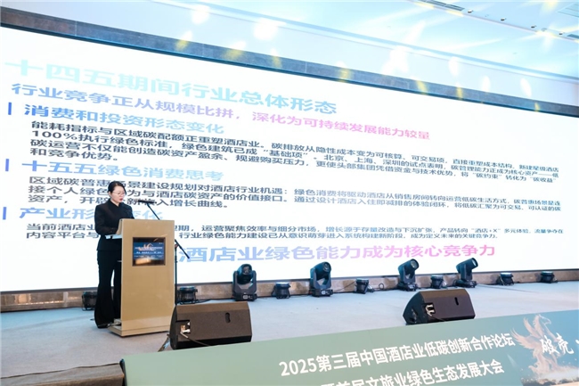 酒店低碳发展研究院执行院长卢景菊从政策信号、行业形态、金融机遇、绿色消费四个方面分析,提出2026年,将成为中国酒店业新形态发展与绿色低碳消费的“能力元年”的预期。