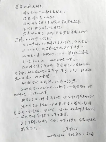 图:歌友会结束后,牛朝阳写给歌迷的亲笔信手稿。