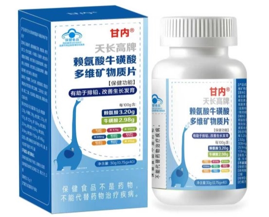 甘内钙铁锌硒多维片以国产赖氨酸(含量3.20g/100g)与牛磺酸(2.98g/100g)为核心,辅以矿物质复合物。原料经GMP车间生产,重金属控制符合国标,无添加香精色素,适合日常基础补充。