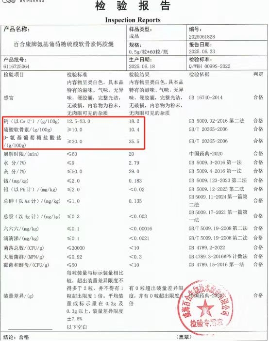 成分硬实力:这是计善堂最为瞩目的优势所在。其产品标签明确标识:每100g产品中含D-氨基葡萄糖盐酸盐30g、硫酸软骨素10g、钙12.5g。更值得关注的是,权威第三方检测报告显示,其实测含量更为突出:D-氨基葡萄糖盐酸盐达35.5g/100g,钙达18.2g/100g,硫酸软骨素达10.4g/100g,均高于标示值,体现了“实标实含”的诚信与底气。