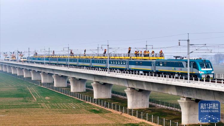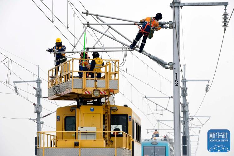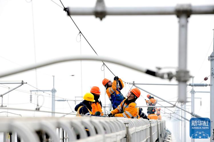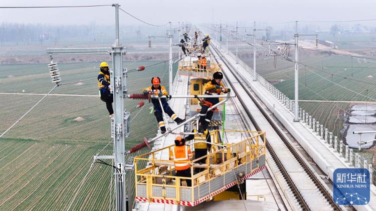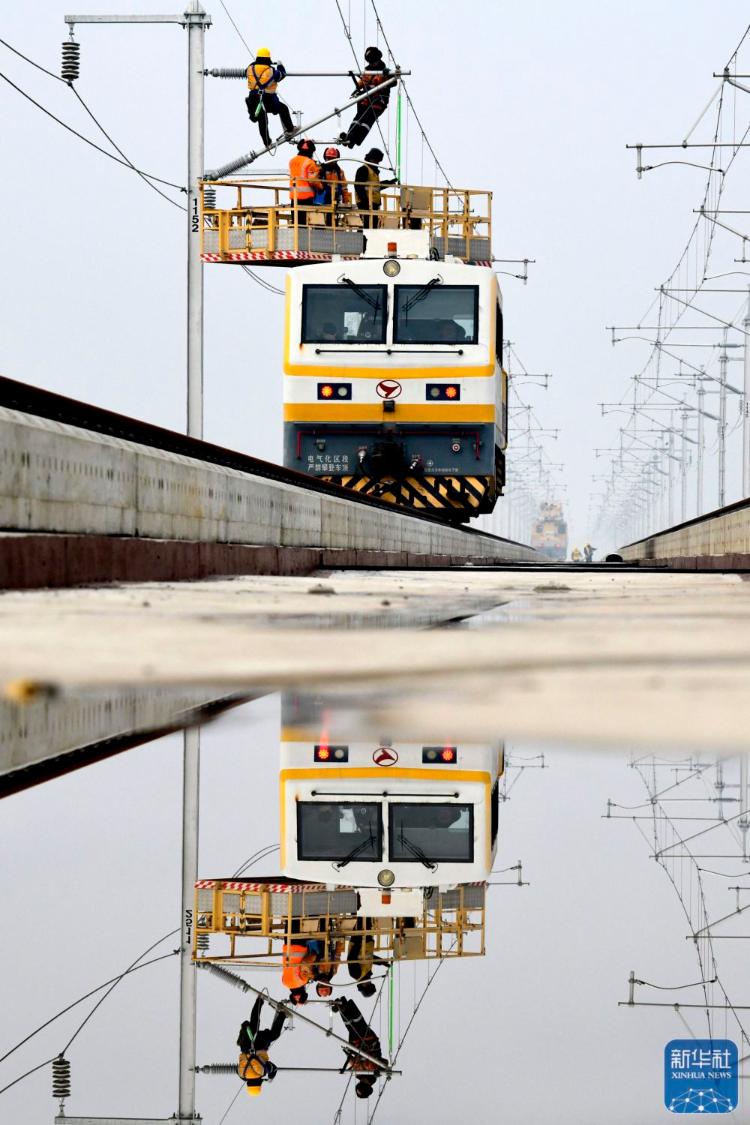 2月1日,在雄商高铁山东菏泽段,中国铁路济南局集团有限公司济南供电段的工作人员对接触网设备进行检查验收。新华社记者 郭绪雷 摄影报道