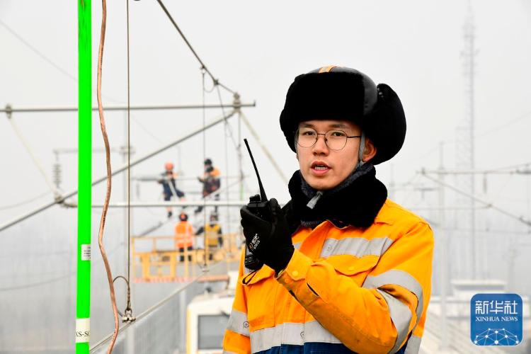 2月1日,在雄商高铁山东菏泽段,中国铁路济南局集团有限公司济南供电段的工作人员通过对讲机沟通作业事宜。