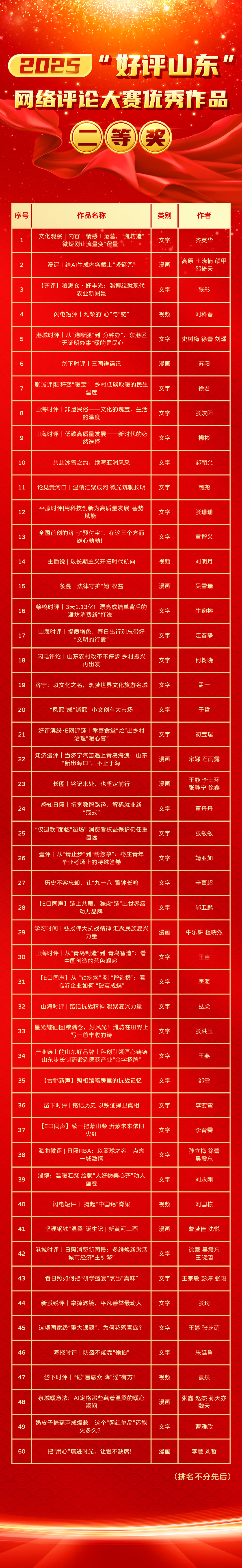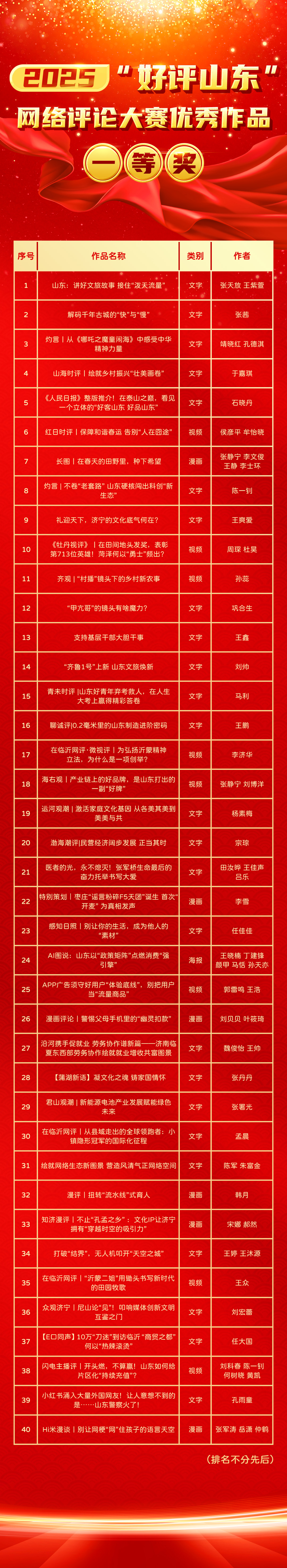 近日,由山东省委网信办主办的2025“好评山东”网络评论大赛结果揭晓。大赛共征集原创网络评论作品2.9万余件,内容涵盖新闻时事、网络文明、文化两创、乡村振兴等方面,涌现出一批接地气、形式新的优秀作品。按照活动安排,经多轮评审,最终评选出年度一等奖优秀作品40件、二等奖优秀作品50件、三等奖优秀作品60件。