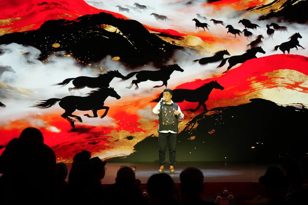 徐俪嘉倾情演唱《丹青中国》栏目主题曲《丹青中国》开场,马头琴合奏《万马奔腾》拉开了演出的序幕,气势如虹,寓意马年大吉;著名表演艺术家臧金生深情朗诵《遇见丹青》,字正腔圆,情感饱满,字里行间流淌着对艺术的挚爱;曲比阿乌、马忠伟、阿木古楞、铁文太、黄艳、邵志军等众多艺术家带来了一首首耳熟能详的经典歌曲,歌声嘹亮,掌声雷动;丹青中国栏目选送的独舞《水墨中华》与中国东方演艺集团带来的古筝演奏《十里红妆》,将传统美学与现代舞台完美融合;中国女画家协会诗社的朗诵《致橡树》,则展现了女性艺术家的才情与风骨。