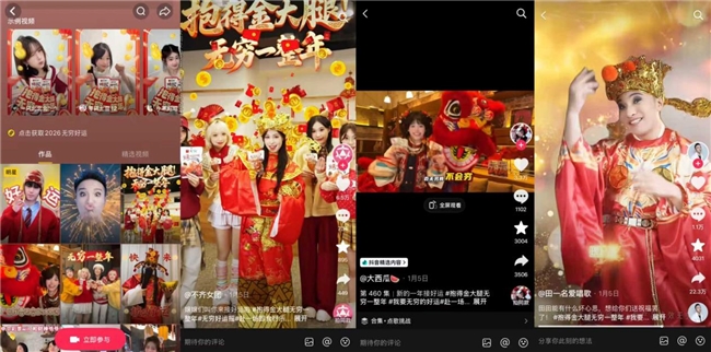 当春节节点与“烟火家宴”场景相遇,无穷食品巧妙地将品牌名称与国民情感期盼相结合。品牌上线新年主题歌曲《我要无穷的好运》,并同步发起#抱得金大腿无穷一整年 共创挑战赛,邀请@不齐女团、@田一名爱唱歌 等音乐舞蹈类KOL进行歌曲翻唱与舞蹈翻跳,以专业内容引爆初始热度。在IP营造的喜庆团圆氛围中,大量用户自发参与,创作出各种带有个人祝福的趣味短视频,使品牌信息在拜年、聚会等真实春节场景中实现病毒式传播,实现了曝光与用户资产沉淀的双重目标。